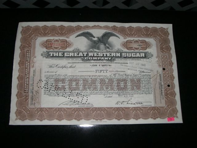 1929 EXTREMELY RARE 50 SHARES STOCK CERTIFICATE *THE GREAT WESTERN SUGAR COMPANY - NICE STOCK CERTIFICATE*!! ***Coin, Currency & All Items Listed in this auction - Grades, Conditions and Values are not Safe Deposit Coins LLC Responsibilty. Grades, Condition and Values are determined by Consigner(s) & Buyers ONLY