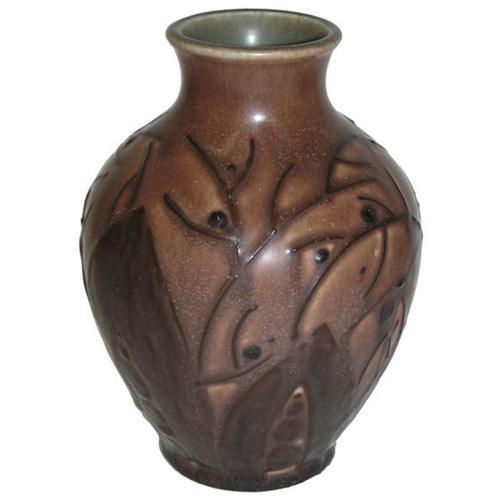 </font></strong>This Rookwood vase was designed by Elizabeth Barrett in 1929. It measures 6.75" high and 4.75" across and is in excellent condition. It features large lotus flower leaves extending up from the bottom and has a purplish brown glaze.