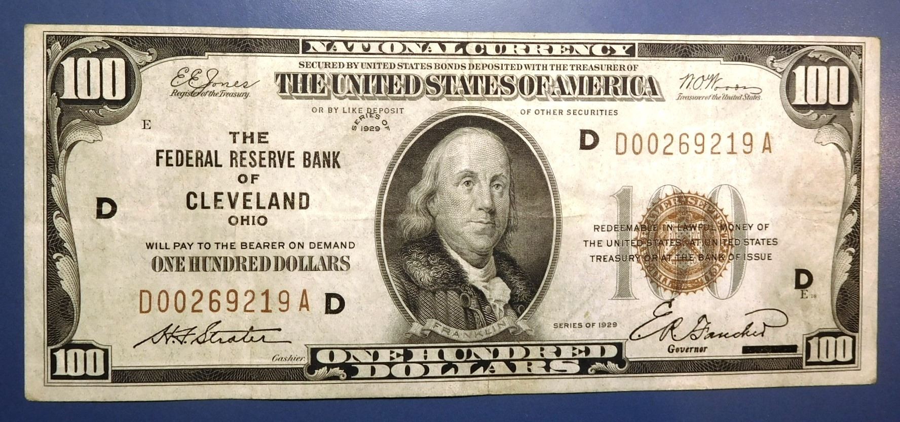 1929 FEDERAL RESERVE BANK OF CLEVELAND, OH $100.00 NOTE XF