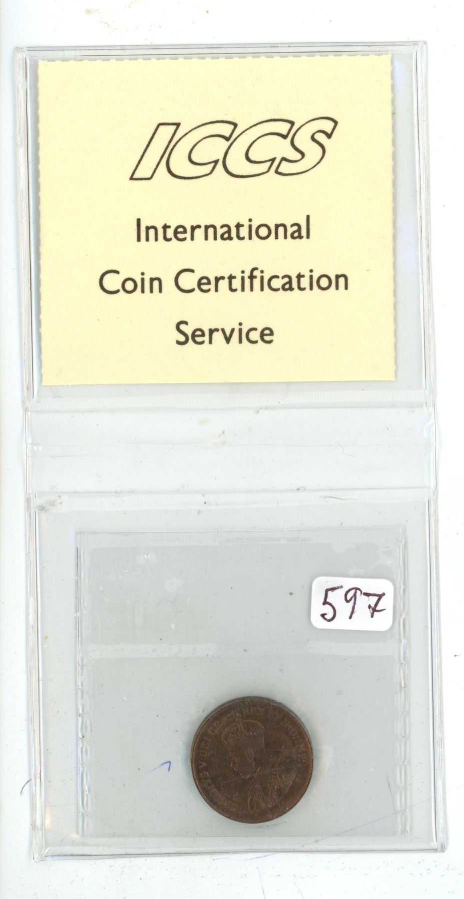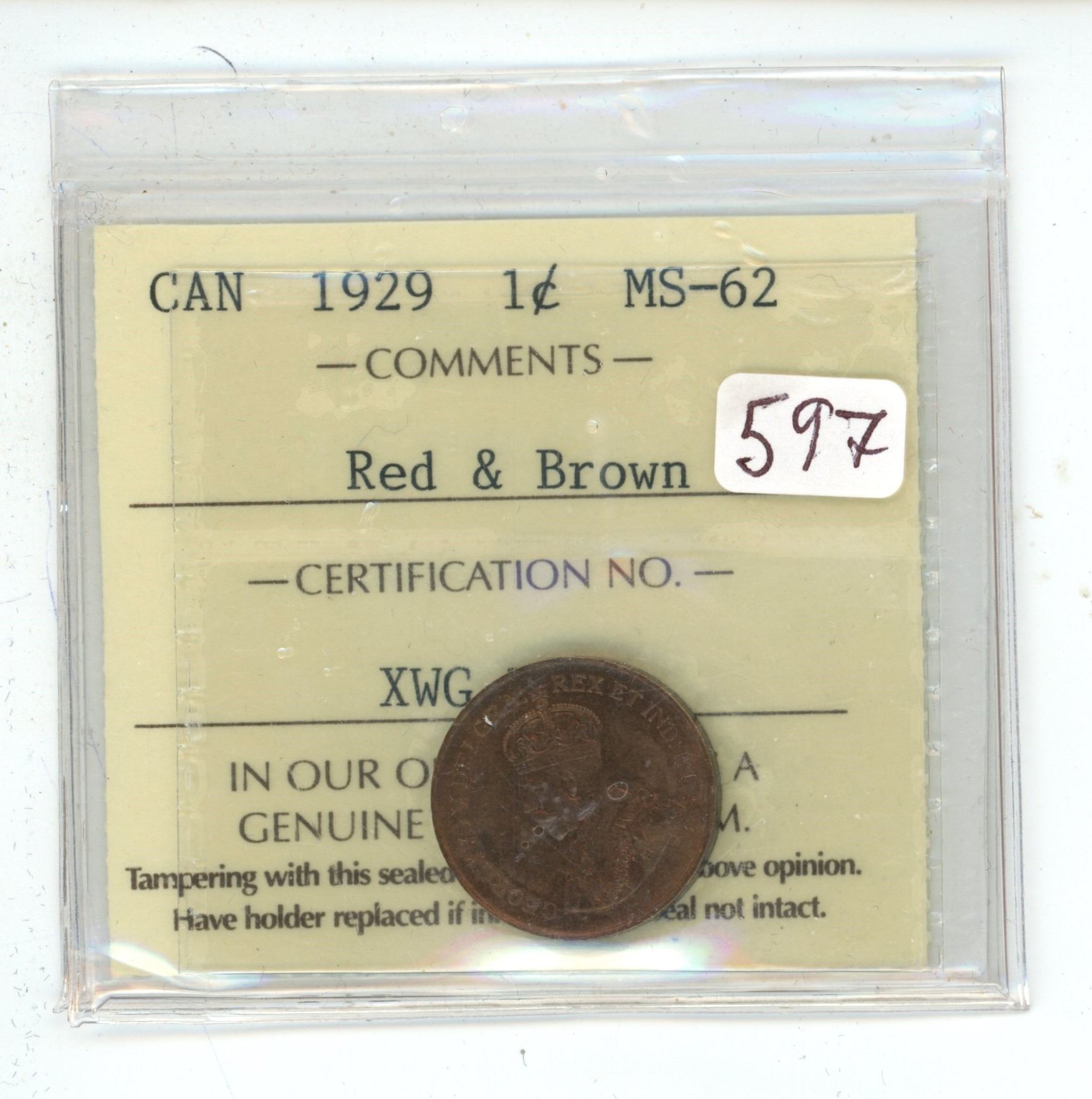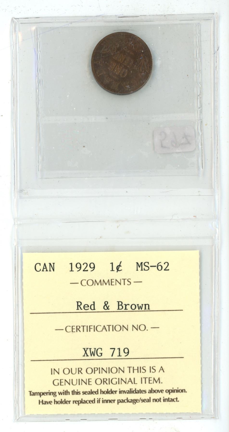 1929 ICCS graded, Canadian 1 cent penny coin - MS62