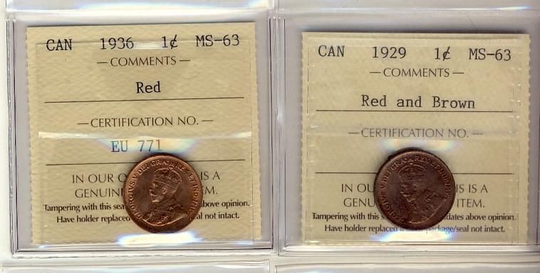 1929 MS63RB & 1936 1¢ MS63RD. Lot of 2 coins both ICCS graded.