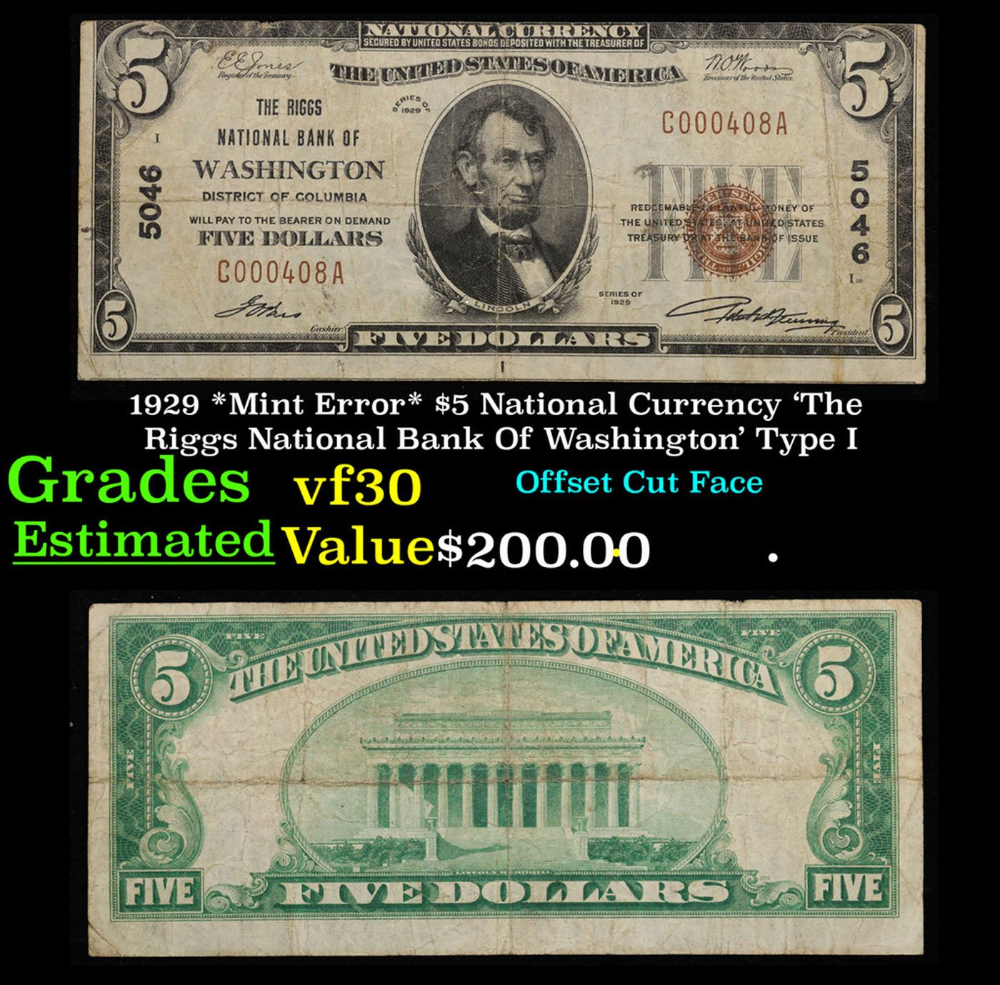 1929 *Mint Error* $5 National Currency 'The Riggs National Bank Of Washington' Type I Grades vf++.