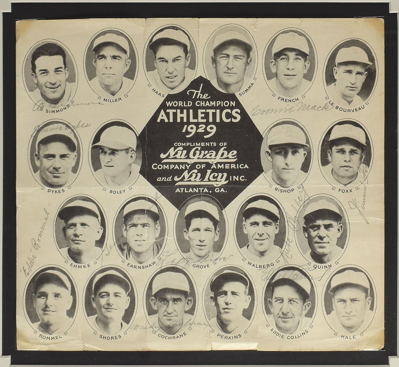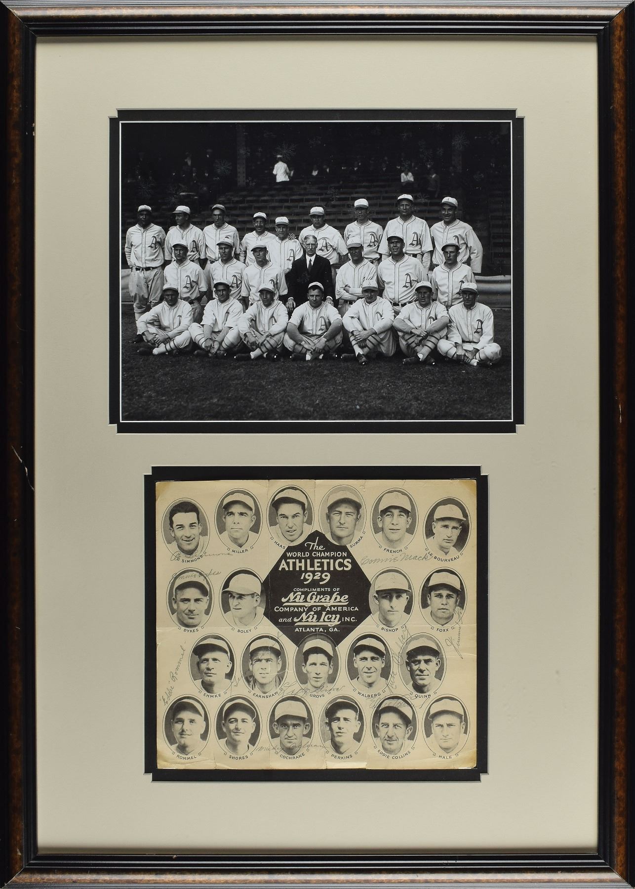 Scarce card-stock 10.25 x 9.25 inch composite advertising premium of the 1929 World Champion Philadelphia A's produced by the Nu Grape Company, signed in pencil by ten members of the World Series–winning team: Jimmie Foxx, Connie Mack, Al Simmons, Lefty Grove, Mickey Cochrane, Eddie Collins, Jimmy Dykes, Eddie Rommel, George Earnshaw, and Rube Walberg. Attractively corner-mounted, matted, and framed with a team photograph to an overall size of 20.5 x 28.5. In very good to fine condition, with intersecting folds and small edge tears. A fantastic composite promo signed by six Hall of Famers.