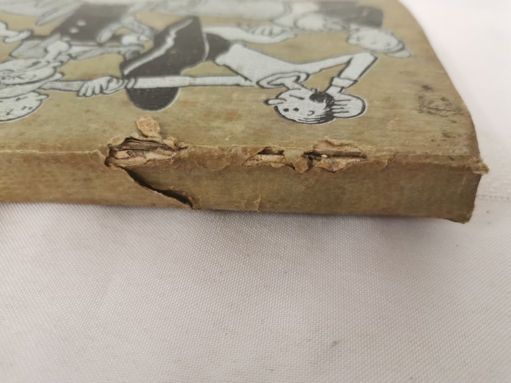King Features Syndicate Popeye Cardboard Pencil box is in fair condition for nearly being a century old. Snap closure is still present but untested due to age of item. There is discolouration and staining around the bottom and inside, and it has a few homemade tape patches. Characters and logo are still quite nice. It measures 8.75"x 5.25" X1" thick with 5 compartments.