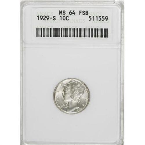 <B>1929-S 10C MS64 Full Bands ANACS.</B></I> NGC Census: (35/64). PCGS Population (97/242). Mintage: 4,730,000. Numismedia Wsl. Price for NGC/PCGS coin in MS64: $133. (#4977)<BR><BR><B>Coin Engraver:</B> Adolph A. Weinman<BR><BR><b>Shipping:</b> Coins & Currency (<a target="_blank" href="http://www.heritageauctions.com/common/shipping.php">view shipping information</a>)