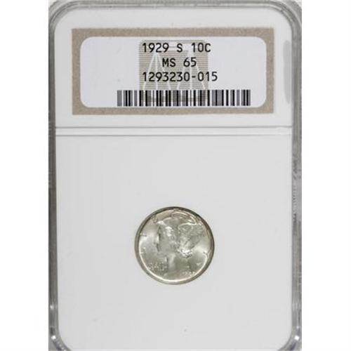 <B>1929-S 10C MS65 NGC.</B></I> NGC Census: (51/46). PCGS Population (47/29). Mintage: 4,730,000. Numismedia Wsl. Price for NGC/PCGS coin in MS65: $104. (#4976)<BR><BR><B>Coin Engraver:</B> Adolph A. Weinman<BR><BR><b>Shipping:</b> Coins & Currency (<a target="_blank" href="http://www.heritageauctions.com/common/shipping.php">view shipping information</a>)