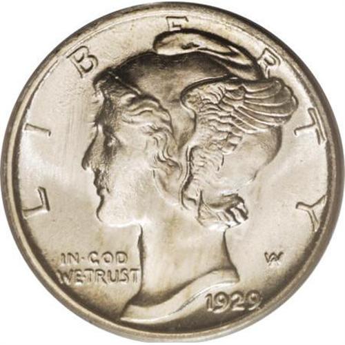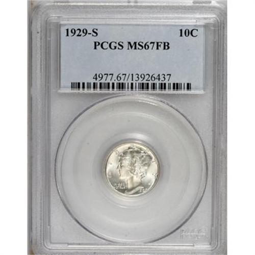 <B>1929-S 10C MS67 Full Bands PCGS.</B></I> A top-notch representative worthy of the finest collection. Hints of pale blue patina in the reverse fields enhance the otherwise silver-white surfaces of this strongly lustrous piece. Both the portrait and the fasces are decisively struck and practically mark-free. Neither NGC nor PCGS has certified a finer Full Bands example (9/07).<BR><BR><B>Coin Engraver:</B> Adolph A. Weinman<BR><BR><b>Shipping:</b> Coins & Currency (<a target="_blank" href="http://www.heritageauctions.com/common/shipping.php">view shipping information</a>)