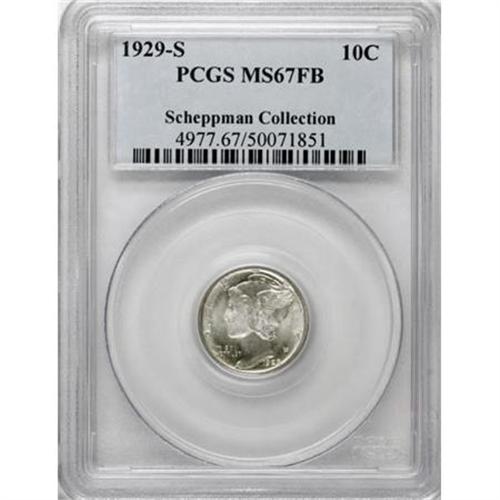 <B>1929-S 10C MS67 Full Bands PCGS.</B></I> Sharply struck with vibrant luster and delightful visual appeal. This Superb Gem offers impressive luster, powerful with just a hint of frost on the virtually immaculate devices. Silver-blue and canary shadings near the margins make a substantial contribution as well. Neither NGC nor PCGS has certified a finer Full Bands coin (12/07).<BR><I>From The Scheppman Collection, #4 PCGS Registry of Full Band Mercury Dimes.</B></I><BR><BR><B>Coin Engraver:</B> Adolph A. Weinman<BR><BR><b>Shipping:</b> Coins & Currency (<a target="_blank" href="http://www.heritageauctions.com/common/shipping.php">view shipping information</a>)