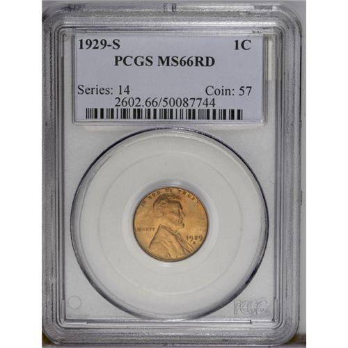<B>1929-S<1C> MS66 Red PCGS.</B></I> A beautiful coin that has the desirable soft Red color throughout and excellent surfaces. Strong eye appeal and problem-free. One minute planchet flaw is present on the upper left reverse rim near the top of the wheat ear. Population: 20 in 66, 0 finer (3/06).<BR><I>From The Kendall Marie #4 All-Time Finest PCGS Registry of Lincoln Cents with Varieties, Circulation Strikes, 1909-1958.</B></I> <BR><BR><B>Important notice:</B> Heritage usually auctions material at the rate of 200-250 lots per hour. On some occasions eBay Live bid software or the Internet may not be able to keep up with the pace of the auction. We recommend placing a realistic absentee bid now as insurance to avoid disappointment. Occasionally the auctioneer may eliminate or reject an eBay Live bid, and the auctioneer may also reopen a lot after the close of the eBay live bidding (usually because we missed an audience bid), and may reject your bid even if it shows you as the winning bidder. By bidding via eBay Live, you agree that Heritage may award the lot to another bidder at its sole discretion under the circumstances described above or any other reasonable circumstances. Since eBay bids are not shown to us until we open the lot on the floor, we treat those bids just like floor bids. In most cases the floor responds before the eBay bid is presented to us, due to Internet lag time, so for consistency we have made it a policy that floor bids are always considered first over tie eBay live bids. Also please note that all Heritage lots purchased through eBay Live carry a 20% Buyer's Premium. Please make sure you read the Terms and Conditions before you bid. This lot is being auctioned in conjunction with a live floor auction by Heritage Galleries & Auctioneers. All final auction and invoice information will be supplied by Heritage Galleries & Auctioneers, and all other information should be considered preliminary. Lot:526 <BR><BR><B>Winning Notification and Billing:</B> After the FINAL session in this auction is complete, Heritage will send e-mail and snail mail invoices. This process normally takes several days. All final auction and invoice information will be supplied by Heritage Galleries & Auctioneers, and all other information should be considered preliminary. <BR><BR>This auction will be conducted on a live auction floor and over the Internet through eBay Live. If you choose to place an absentee bid, please take a moment to <font color='#0000ff'><u><a href='http://pages.ebay.com/liveauctions/help/before/laabsentee.html'>learn how eBay Live absentee bidding works</a></u></font><font color='#000000'>