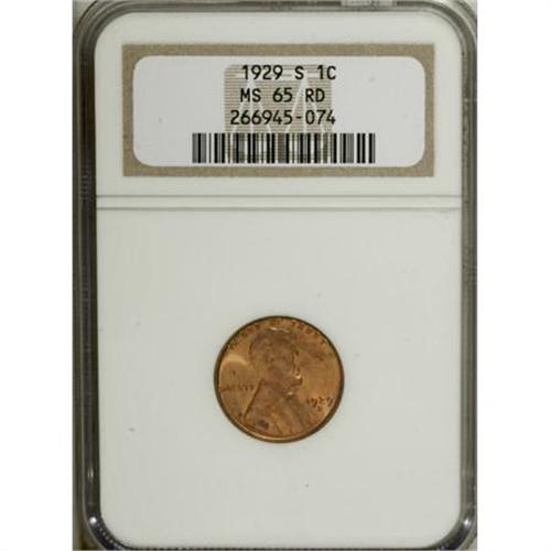 <B>1929-S 1C MS65 Red NGC.</B></I> NGC Census: (135/23). PCGS Population (199/20). Mintage: 50,148,000. Numismedia Wsl. Price for NGC/PCGS coin in MS65: $380. (#2602)<BR><BR><B>Coin Engraver:</B> Victor D. Brenner<BR><BR><b>Shipping:</b> Coins & Currency (<a target="_blank" href="http://www.heritageauctions.com/common/shipping.php">view shipping information</a>)