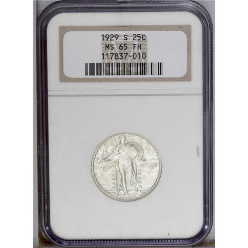 <B>1929-S<25C> MS65 Full Head NGC.</B></I> Freckles of apricot toning endow this lustrous and suitably struck San Francisco type coin. A few tiny marks on the legs prevent a higher grade.
