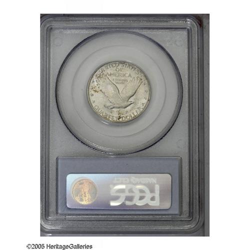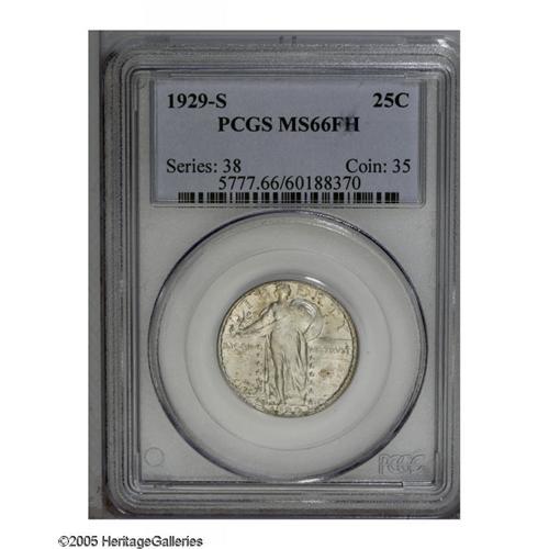 <B>1929-S<25C> MS66 Full Head PCGS.</B></I> Fully lustrous surfaces are visited by dappled olive-green patina around the margins. The design elements are nicely struck, culminating in Full Head designation, though the inner shield and a couple of the lower rivets are weak. The surfaces are well preserved throughout, but perusal under a glass reveals a scrape on Liberty's ribbon under her outstretched left (facing) hand. Population: 90 in 66, 7 finer (12/05).
