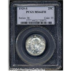 <B>1929-S<25C> MS66 Full Head PCGS.</B></I> A few speckles of olive and golden-brown color are scattered over lustrous surfaces that are virtually devoid of significant marks. The design elements are well struck throughout. Population: 86 in 66, 7 finer (9/04). <BR><BR><B>Important notice:</B> Heritage usually auctions material at the rate of 200-250 lots per hour. On some occasions eBay Live bid software or the Internet may not be able to keep up with the pace of the auction. We recommend placing a realistic absentee bid now as insurance to avoid disappointment. Occasionally the auctioneer may eliminate or reject an eBay Live bid, and the auctioneer may also reopen a lot after the close of the eBay live bidding (usually because we missed an audience bid), and may reject your bid even if it shows you as the winning bidder. By bidding via eBay Live, you agree that Heritage may award the lot to another bidder at its sole discretion under the circumstances described above or any other reasonable circumstances. Since eBay bids are not shown to us until we open the lot on the floor, we treat those bids just like floor bids. In most cases the floor responds before the eBay bid is presented to us, due to Internet lag time, so for consistency we have made it a policy that floor bids are always considered first over tie eBay live bids. Also please note that all Heritage lots purchased through eBay Live carry a 20% Buyer's Premium. Please make sure you read the Terms and Conditions before you bid.