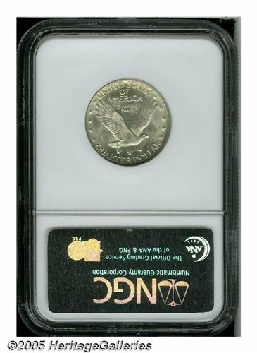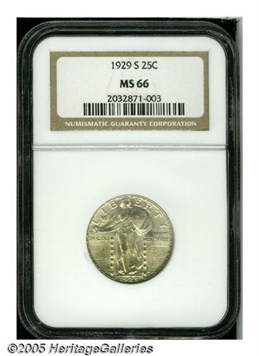 <B>1929-S<25C> MS66 NGC.</B></I> Typically struck and highly lustrous, with slight weakness on Liberty's head and shield, this visually pleasing premium Gem has a rich sheen on both sides, pale golden color on the obverse, and an untoned reverse. Nearly mark-free, except for a couple of tiny contact marks below Liberty's left (facing) knee.