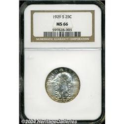 <B>1929-S<25C> MS66 NGC.</B></I> Sharply struck, with nice (though not full) head detail. Radiant luster emanates from satiny surfaces that display a film of lavender-tan toning on the reverse and along the obverse margins which frame brilliant centers. The surfaces are virtually free of significant marks. Population: 92 in 66, 16 finer (9/04). <BR><BR><B>Important notice:</B> Heritage usually auctions material at the rate of 200-250 lots per hour. On some occasions eBay Live bid software or the Internet may not be able to keep up with the pace of the auction. We recommend placing a realistic absentee bid now as insurance to avoid disappointment. Occasionally the auctioneer may eliminate or reject an eBay Live bid, and the auctioneer may also reopen a lot after the close of the eBay live bidding (usually because we missed an audience bid), and may reject your bid even if it shows you as the winning bidder. By bidding via eBay Live, you agree that Heritage may award the lot to another bidder at its sole discretion under the circumstances described above or any other reasonable circumstances. Since eBay bids are not shown to us until we open the lot on the floor, we treat those bids just like floor bids. In most cases the floor responds before the eBay bid is presented to us, due to Internet lag time, so for consistency we have made it a policy that floor bids are always considered first over tie eBay live bids. Also please note that all Heritage lots purchased through eBay Live carry a 20% Buyer's Premium. Please make sure you read the Terms and Conditions before you bid.