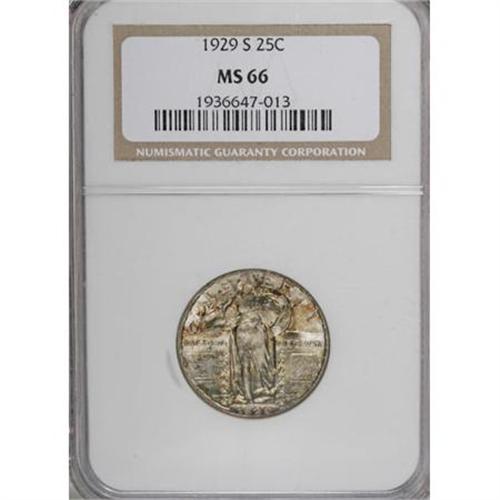 <B>1929-S 25C MS66 NGC.</B></I> Dazzling luster projects from both sides of this sharply struck Premium Gem. Golden-tan patina bathes the impeccably preserved surfaces. An enticing later Standing Liberty quarter.<BR><BR><B>Coin Engraver:</B> Hermon A. MacNeil<BR><BR><b>Shipping:</b> Coins & Currency (<a target="_blank" href="http://www.heritageauctions.com/common/shipping.php">view shipping information</a>)