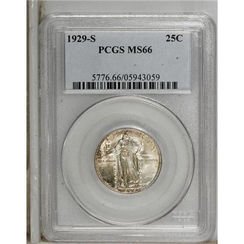 <B>1929-S 25C MS66 PCGS.</B></I> While not completely struck in other areas as well, the all-important head detail on Liberty is just an ear hole away from Full Head status. Lustrous with pale, pastel toning over each side.<BR><BR><b>Shipping:</b> Coins & Currency (<a target="_blank" href="http://www.heritageauctions.com/common/shipping.php">view shipping information</a>)