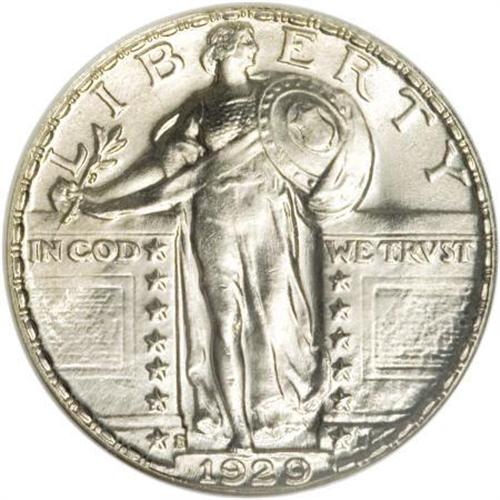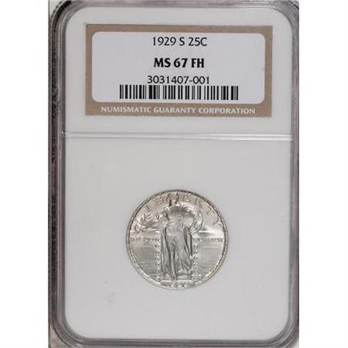 <B>1929-S 25C MS67 Full Head NGC.</B></I> A gleaming and sharply struck Superb Gem example of this late-date Standing Liberty issue, largely untoned with just a hint of green-gold at the lower left reverse. The spectacularly preserved surfaces appear immaculate, even under magnification. Tied for the finest Full Head example graded by either NGC or PCGS (12/07).<BR><BR><B>Coin Engraver:</B> Hermon A. MacNeil<BR><BR><b>Shipping:</b> Coins & Currency (<a target="_blank" href="http://www.heritageauctions.com/common/shipping.php">view shipping information</a>)