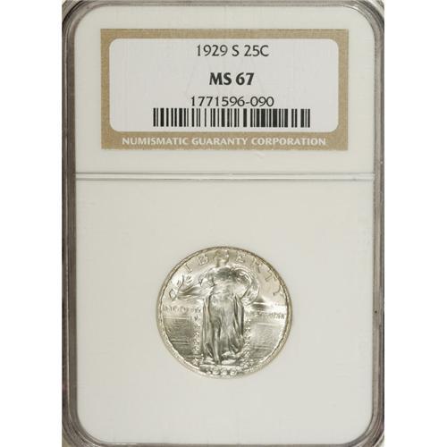 <B>1929-S 25C MS67 NGC.</B></I> About 80% of the head details remain on this delightful Superb Gem example. Both sides are fully brilliant with intense silver luster. Perhaps this coin is from the hoard of 200 pieces that was discovered in California just over 30 years ago.<BR><BR><b>Shipping:</b> Coins & Currency (<a target="_blank" href="http://www.heritageauctions.com/common/shipping.php">view shipping information</a>)
