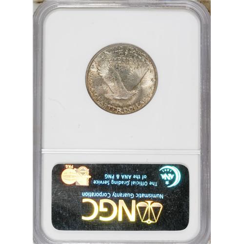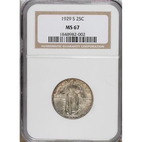 <B>1929-S 25C MS67 NGC.</B></I> Standing Liberty quarter specialist J.H. Cline (2007) writes that: "The 1929-S, as most S mints, were average or poor strikes. Full Heads are an exception and certainly not the rule." The Superb Gem in this lot is somewhat better struck than most. Liberty's chain mail and the inner shield are relatively sharp, and the head displays good (though not full) detail. Two or three of the lower rivets are weak. Dapples of reddish-tan visit highly lustrous surfaces that are devoid of mentionable marks. Census: 22 in 67, 0 finer (2/07).<BR><BR><b>Shipping:</b> Coins & Currency (<a target="_blank" href="http://www.heritageauctions.com/common/shipping.php">view shipping information</a>)