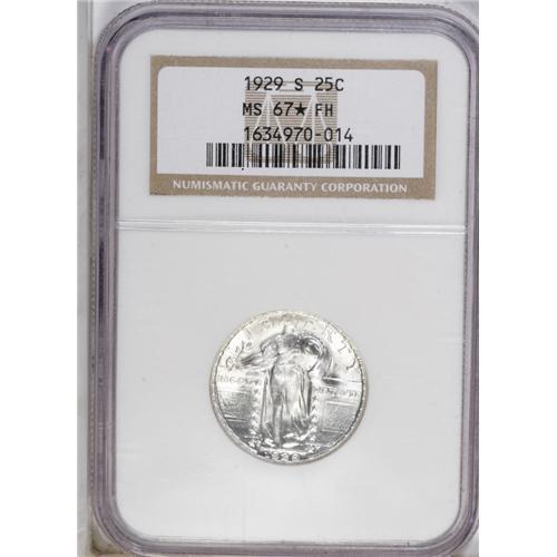 <B>1929-S<25C> MS67 <img border='0' src='http://www.heritagecoins.com/images/star.gif' width=10 height=10> Full Head NGC.</B></I> A blazing Superb Gem example virtually as nice as the moment is came from the dies. Fully brilliant. Most design features are sharp including Liberty's chain-mail cuirass. Not a particularly scarce issue in grades up to MS65, but certainly an important condition rarity at the MS67 level, as attested to by the NGC census information. Census: 3 in 67 <img border='0' src='http://www.heritagecoins.com/images/star.gif' width=10 height=10>, 0 finer (7/06).<BR><I>From The Brevard Gold & Silver Former #2 NGC Registry of Standing Liberty Quarters.</B></I>
