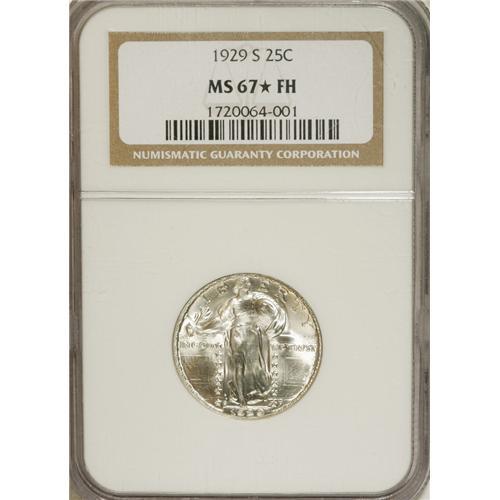 <B>1929-S 25C MS67 <img border='0' src='http://www.heritagecoins.com/images/star.gif' width=10 height=10> Full Head NGC.</B></I> Essentially untoned and brilliant. This example should satisfy those collectors desiring "white" coins. The design elements are sharply defined throughout, save for the lower rivets on the outer shield. A small tick above Liberty's right knee, and a small luster graze on the railing of the right gate do not detract from this marvelous coin. Census: 3 in 67 <img border='0' src='http://www.heritagecoins.com/images/star.gif' width=10 height=10> Full Head, 0 finer (4/07).<BR><BR><b>Shipping:</b> Coins & Currency (<a target="_blank" href="http://www.heritageauctions.com/common/shipping.php">view shipping information</a>)