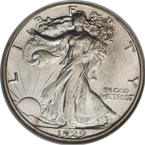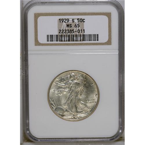 <B>1929-S 50C MS65 NGC.</B></I> Delicate golden-brown toning ensures the originality of this lustrous and crisply struck Gem. A vertical spindly die crack bisects the eagle, but post-strike abrasions are nearly absent. The 1929-S is plentiful in well circulated grades, but becomes rare at the MS65 level.<BR><BR><b>Shipping:</b> Coin/Currency (<a target="_blank" href="http://www.heritageauctions.com/common/shipping.php">view shipping information</a>)