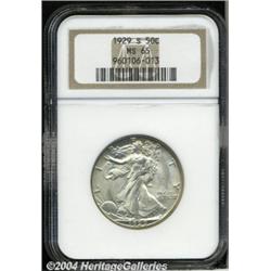 <B>1929-S<50C> MS65 NGC.</B></I> Frosty surfaces and very well struck for this often weak San Francisco Mint issue. One small mark is noted in the right obverse field under the Y of LIBERTY. Very attractive and worthy of considerable bidder interest. Population: 95 in 65, 30 finer (7/04). <BR><BR><B>Important notice:</B> Heritage usually auctions material at the rate of 200-250 lots per hour. On some occasions eBay Live bid software or the Internet may not be able to keep up with the pace of the auction. We recommend placing a realistic absentee bid now as insurance to avoid disappointment. Occasionally the auctioneer may eliminate or reject an eBay Live bid, and the auctioneer may also reopen a lot after the close of the eBay live bidding (usually because we missed an audience bid), and may reject your bid even if it shows you as the winning bidder. By bidding via eBay Live, you agree that Heritage may award the lot to another bidder at its sole discretion under the circumstances described above or any other reasonable circumstances. Since eBay bids are not shown to us until we open the lot on the floor, we treat those bids just like floor bids. In most cases the floor responds before the eBay bid is presented to us, due to Internet lag time, so for consistency we have made it a policy that floor bids are always considered first over tie eBay live bids. Also please note that all Heritage lots purchased through eBay Live carry a 20% Buyer's Premium. Please make sure you read the Terms and Conditions before you bid. </span></font></tr></table></td></tr></table>