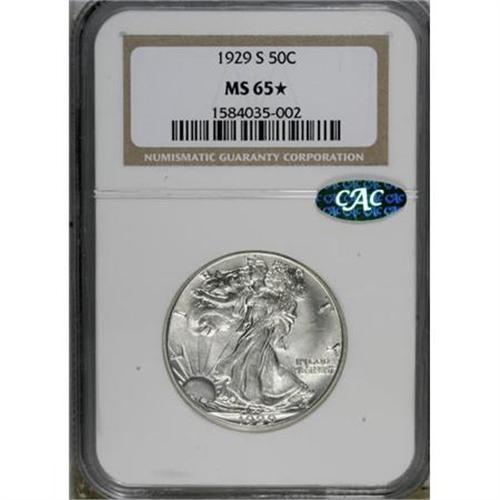 <B>1929-S 50C MS65 <img src="/images/star.gif" width="10" height="10" alt="" border="0"> NGC. CAC.</B></I> Bright luster radiates from the color-free surfaces of this lovely Gem to which NGC has awarded the Star designation. An exacting strike imparts strong definition to the design features, including the gown lines and branch hand. Both sides exhibit impeccably preserved surfaces. Census: 1 in 65 <B><img src="/images/star.gif" width="10" height="10" alt="" border="0"></B></I>, 4 with Star finer (1/08).<BR><BR><B>Coin Engraver:</B> Adolph A. Weinman<BR><BR><b>Shipping:</b> Coins & Currency (<a target="_blank" href="http://www.heritageauctions.com/common/shipping.php">view shipping information</a>)