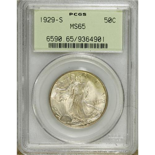 <B>1929-S 50C MS65 PCGS.</B></I> This shimmering Gem offers light olive-green and pearl-gray patina, with surfaces that are splendidly free from contact, The strike is not full, but it is above-average. A network of fine die cracks (as made) traverses the reverse. Encapsulated in a green-label holder. PCGS has certified only 39 pieces in higher grades (1/07).<BR><BR><b>Shipping:</b> Coins & Currency (<a target="_blank" href="http://www.heritageauctions.com/common/shipping.php">view shipping information</a>)