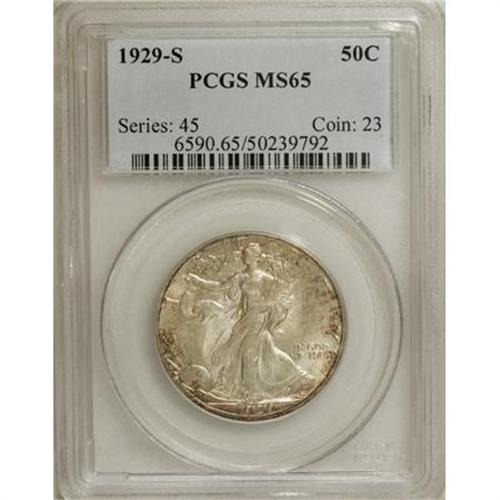 <B>1929-S 50C MS65 PCGS.</B></I> Even though the 1929-S had a rather substantial mintage of 1.9 million pieces, it is quite elusive in Uncirculated grades and especially in Gem condition. This is a highly lustrous coin that shows slight streaky russet toning that deepens somewhat around the margins. Better struck than many '29-S halves, this piece is also carefully preserved and free of distractions. <BR><BR><B>Coin Engraver:</B> Adolph A. Weinman<BR><BR><b>Shipping:</b> Coins & Currency (<a target="_blank" href="http://www.heritageauctions.com/common/shipping.php">view shipping information</a>\)