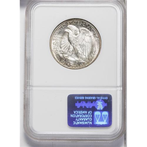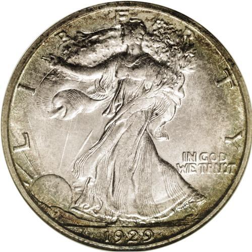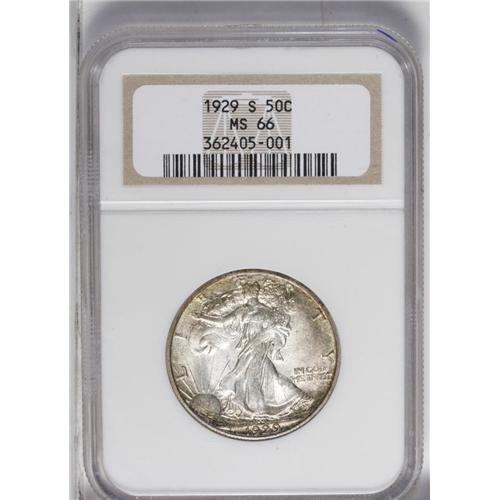 <B>1929-S<50C> MS66 NGC.</B></I> A Depression-era issue that generally was not held back from circulation and is most often seen well worn. Striking quality runs the gamut from poor to completely struck, and while this piece is not fully detailed, it is certainly better defined than most of this conditionally elusive S-mint. Each side exhibits a clean, satin-like appearance and the obverse is framed in mottled sea-green, olive, and rose patina. The reverse has much fainter peripheral toning. Unusually thick die striations (as struck) are noted on both sides, and are easiest to see in the left obverse field. Census: 29 in 66, 4 finer (8/06).<BR><I>From The Big Tex Registry Set of Walking Liberty Halves.</B></I>