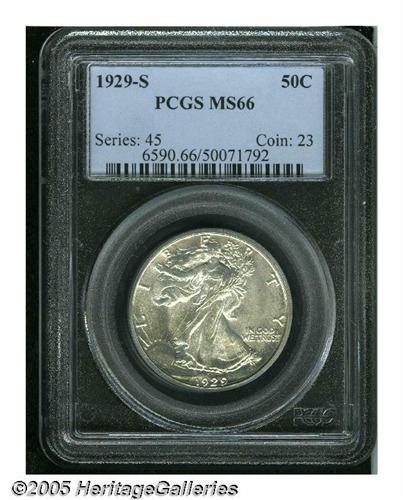 <B>1929-S<50C> MS66 PCGS.</B></I> Walter Breen recorded varieties of this issue with and without the AW monogram. This example is a hybrid, having the monogram visible but extremely weak. This is a satiny Gem with fully brilliant silver luster. The reverse has prooflike fields created by heavy die polish. About as fully struck as they come, and worthy of a premium bid. Population: 37 in 66, 1 finer (6/05).<BR><I>From The Robert Moreno Collection.</B></I>