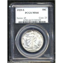 <table><tr><td><TABLE cellSpacing=0 cellPadding=0 width="100%" bgColor=#000000 border=0><TBODY> <TR><TD width="100%"><TABLE cellSpacing=1 cellPadding=3 width="100%" border=0><TBODY><TR><TD width="100%" bgColor=#79735c><FONT face=arial color=#ffffff size=3><B>Description</B> </FONT></TD></TR><TR><TD width="100%" bgColor=#ffffff><FONT face=arial size=2><B>1929-S 50C MS66 PCGS.</B></I> The onset of the Great Depression this year probably explains why the 1929-D and 1929-S are the most plentiful Half Dollars from the 1920s in Mint State. In terms of total number of coins extant, the '29-S is rarer than the '29-D in grades above AU. This may come as a shock to some because the former issue has a higher mintage of 1.9 million pieces (vs. 1 million coins for the 1929-D). It may also come as a surprise to collectors to learn that the 1929-S is the better struck of the two issues. Indeed, this high end Gem is sharply struck throughout with especially praiseworthy definition on the obverse over Liberty's head and on the reverse over the eagle's breast feathers. The luster is full, richly frosted, and accented in freckled copper-russet patina. There is not a single bothersome abrasion to report. Population: 30 in 66, 0 finer (10/03). </FONT></TD></TR></TBODY></TABLE></TD></TR></TBODY></TABLE><BR><A name=PricesRealized></A><TABLE cellSpacing=0 cellPadding=0 width="100%" bgColor=#000000 border=0><TBODY><TR><TD width="100%"><TABLE cellSpacing=1 cellPadding=3 width="100%" border=0><TBODY><TR><TD width="100%" bgColor=#79735c><A name=PR><FONT face=arial color=#ffffff size=3><B>Previous Prices from Heritage Auctions</B> </FONT></A></TD></TR><TR><TD bgColor=#f6f6ed><TABLE cellSpacing=0 cellPadding=0 width="100%" border=1><TBODY><TR><TD align=middle width="33%"><B>Date</B></TD><TD align=middle width="33%"><B>Service</B></TD><TD align=middle width="33%"><B>Price</B></TD></TR><TR bgColor=whitesmoke><TD width="33%"><B>09/20/2003</B></TD><TD width="33%">PCGS</TD><TD width="33%">$5,290.00</TD></TR><TR bgColor=whitesmoke><TD width="33%"><B>04/27/2002</B></TD><TD width="33%">PCGS</TD><TD width="33%">$5,175.00</TD></TR><TR bgColor=whitesmoke><TD width="33%"><B>11/15/2001</B></TD><TD width="33%">PCGS</TD><TD width="33%">$3,795.00</TD></TR><TR bgColor=whitesmoke><TD width="33%"><B>03/19/1997</B></TD><TD width="33%">NGC</TD><TD width="33%">$2,090.00</TD></TR><TR bgColor=whitesmoke><TD width="33%"><B>02/01/1998</B></TD><TD width="33%">NGC</TD><TD width="33%">$2,310.00</TD></TR></TBODY></TABLE></TD></TR><TR><TD bgColor=#ffffff><FONT face=arial size=1 ?>PLEASE NOTE: All prices realized reflect the final hammer price PLUS the buyer's premium in auctions that charge a buyer's premium. Each item has a notation at the top of the listing indicating whether that lot included a buyer's premium. Example: A item that sells with a final hammer price of $100 and a 20% buyer's premium will display with a price realized of $120. All information listed is intended to be as accurate as possible, but errors are possible. Please use this guide carefully and inform us of any inaccuracies. </FONT></TD></TR></TBODY></TABLE></TD></TR></TBODY></TABLE><BR><TABLE cellSpacing=0 cellPadding=0 width="100%" bgColor=#000000 border=0><TBODY><TR><TD width="100%"><TABLE cellSpacing=1 cellPadding=3 width="100%" border=0><TBODY><TR><TD width="100%" bgColor=#79735c colSpan=6><FONT face=arial color=#ffffff size=3><B>Price Guide*</B> </FONT></TD></TR><TR bgColor=#f6f6ed><TD align=middle><B>Grade</B> </TD><TD align=middle><B>Coin World<BR>(Trends)</B> </TD><TD align=middle><B>Numismedia<BR>Retail</B> </TD><TD align=middle><B>Numismedia<BR>Wholesale</B> </TD><TD align=middle><B>Coin<BR>Universe</B> </TD><TD align=middle><B>Heritage<BR>Value Index</B> </TD></TR><TR bgColor=#ffffff><TD align=middle>65</TD><TD align=right>$2,500.00</TD><TD align=right>---</TD><TD align=right>$1,825.00</TD><TD align=right>$2,650.00</TD><TD align=right>$1,896.25</TD></TR><TR style="FONT-WEIGHT: bold" bgColor=#cccfdd><TD align=middle>66</TD><TD align=right>$5,000.00</TD><TD align=right>---</TD><TD align=right>$3,625.00</TD><TD align=right>$6,500.00</TD><TD align=right>$4,025.00</TD></TR><TR bgColor=#ffffff><TD align=middle>67</TD><TD align=right>---</TD><TD align=right>---</TD><TD align=right>---</TD><TD align=right>---</TD><TD align=right>---</TD></TR><TR bgColor=#ffffff><TD colSpan=6><FONT size=1>*All information listed is intended to be as accurate as possible, but errors are possible. No item may be returned or refused based on this information which is provided as a service to our customers. You should contact each pricing source directly to determine the accuracy of this information. </FONT></TD></TR></TBODY></TABLE></TD></TR></TBODY></TABLE><BR><TABLE cellSpacing=0 cellPadding=0 width="100%" bgColor=#000000 border=0><TBODY><TR><TD width="100%"><TABLE cellSpacing=1 cellPadding=3 width="100%" border=0><TBODY><TR><TD width="100%" bgColor=#79735c><FONT face=arial color=#ffffff size=3><B>Population Guide</B> </FONT></TD></TR><TR bgColor=#ffffff><TD align=middle><!-- Begin Output of Population Grid--><TABLE cellSpacing=0 cellPadding=0 width="100%" border=0><TBODY><TR><TD vAlign=center><TABLE cellSpacing=0 width="100%" border=1 cellsadding="3"><TBODY><TR><TD vAlign=center><TABLE cellSpacing=0 cellPadding=3 width="100%" border=1><TBODY><TR><TD vAlign=center align=middle bgColor=#f0f1e8 colSpan=2 <CENTER><FONT face=Arial size=2><B>PCGS Pop </B></FONT><CENTER></CENTER></TD><TD vAlign=center align=middle bgColor=#f0f1e8 colSpan=2><CENTER><FONT face=Arial size=2><B>NGC Pop</B></CENTER></FONT></TD></TR><TR><TD vAlign=center><FONT face=Arial size=2>(66)</FONT> </TD><TD vAlign=center align=right><FONT face=Arial size=2>30</FONT> </TD><TD vAlign=center><FONT face=Arial size=2>(66)</FONT> </TD><TD vAlign=center align=right><FONT face=Arial size=2>24</FONT> </TD></TR><TR><TD vAlign=center><FONT face=Arial size=2>(>66)</FONT> </TD><TD vAlign=center align=right><FONT face=Arial size=2>0</FONT> 
