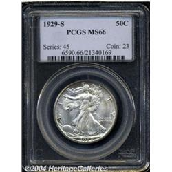 <B>1929-S<50C> MS66 PCGS.</B></I> The onset of the Great Depression this year probably explains why the 1929-D and 1929-S are the most plentiful Half Dollars from the 1920s in Mint State. In terms of total number of coins extant, the '29-S is rarer than the '29-D in grades above AU. This may come as a shock to some because the former issue has a higher mintage of 1.9 million pieces (vs. 1 million coins for the 1929-D). It may also come as a surprise to collectors to learn that the 1929-S is the better struck of the two issues. Indeed, this high end Gem is sharply struck throughout with especially praiseworthy definition on the obverse over Liberty's head and on the reverse over the eagle's breast feathers. The luster is full, richly frosted, and accented in freckled copper-russet patina. There is not a single bothersome abrasion to report. Population: 33 in 66, 0 finer (7/04).<BR><I>From The Del Rio Collection, Part Two.</B></I> <BR><BR><B>Important notice:</B> Heritage usually auctions material at the rate of 200-250 lots per hour. On some occasions eBay Live bid software or the Internet may not be able to keep up with the pace of the auction. We recommend placing a realistic absentee bid now as insurance to avoid disappointment. Occasionally the auctioneer may eliminate or reject an eBay Live bid, and the auctioneer may also reopen a lot after the close of the eBay live bidding (usually because we missed an audience bid), and may reject your bid even if it shows you as the winning bidder. By bidding via eBay Live, you agree that Heritage may award the lot to another bidder at its sole discretion under the circumstances described above or any other reasonable circumstances. Since eBay bids are not shown to us until we open the lot on the floor, we treat those bids just like floor bids. In most cases the floor responds before the eBay bid is presented to us, due to Internet lag time, so for consistency we have made it a policy that floor bids are always considered first over tie eBay live bids. Also please note that all Heritage lots purchased through eBay Live carry a 20% Buyer's Premium. Please make sure you read the Terms and Conditions before you bid. </span></font></tr></table></td></tr></table>