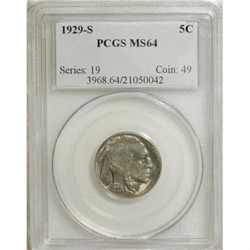 <B>1929-S 5C MS64 PCGS.</B></I> PCGS Population (527/545). NGC Census: (330/197). Mintage: 7,754,000. Numismedia Wsl. Price for NGC/PCGS coin in MS64: $132. (#3968)<BR><BR><b>Shipping:</b> Coins & Currency (<a target="_blank" href="http://www.heritageauctions.com/common/shipping.php">view shipping information</a>)