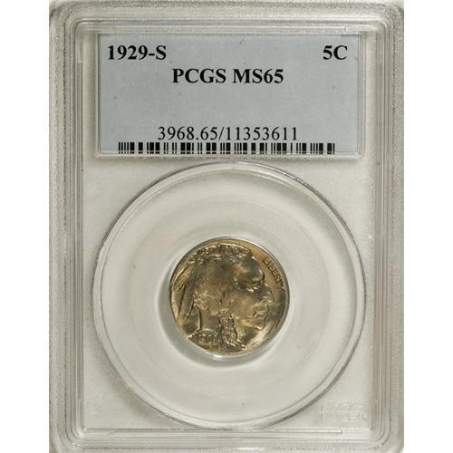 <B>1929-S 5C MS65 PCGS.</B></I> PCGS Population (387/158). NGC Census: (154/43). Mintage: 7,754,000. Numismedia Wsl. Price for NGC/PCGS coin in MS65: $400. (#3968)<BR><BR><b>Shipping:</b> Coins & Currency (<a target="_blank" href="http://www.heritageauctions.com/common/shipping.php">view shipping information</a>)