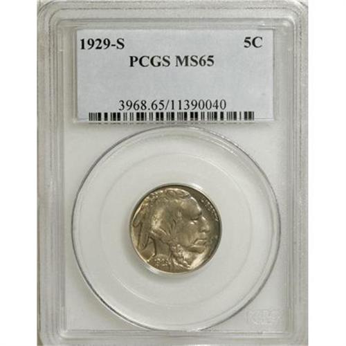 <B>1929-S 5C MS65 PCGS.</B></I> PCGS Population (387/158). NGC Census: (153/44). Mintage: 7,754,000. Numismedia Wsl. Price for NGC/PCGS coin in MS65: $400. (#3968)<BR><BR><b>Shipping:</b> Coins & Currency (<a target="_blank" href="http://www.heritageauctions.com/common/shipping.php">view shipping information</a>)