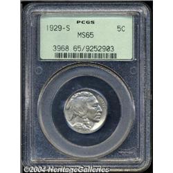 <B>1929-S<5C> MS65 PCGS.</B></I> Generally nicely struck, save for softness on part of the Indian's hair, and the surfaces on both sides seemingly free of abrasions. <BR><BR><B>Important notice:</B> Heritage usually auctions material at the rate of 200-250 lots per hour. On some occasions eBay Live bid software or the Internet may not be able to keep up with the pace of the auction. We recommend placing a realistic absentee bid now as insurance to avoid disappointment. Occasionally the auctioneer may eliminate or reject an eBay Live bid, and the auctioneer may also reopen a lot after the close of the eBay live bidding (usually because we missed an audience bid), and may reject your bid even if it shows you as the winning bidder. By bidding via eBay Live, you agree that Heritage may award the lot to another bidder at its sole discretion under the circumstances described above or any other reasonable circumstances. Since eBay bids are not shown to us until we open the lot on the floor, we treat those bids just like floor bids. In most cases the floor responds before the eBay bid is presented to us, due to Internet lag time, so for consistency we have made it a policy that floor bids are always considered first over tie eBay live bids. Also please note that all Heritage lots purchased through eBay Live carry a 20% Buyer's Premium. Please make sure you read the Terms and Conditions before you bid.