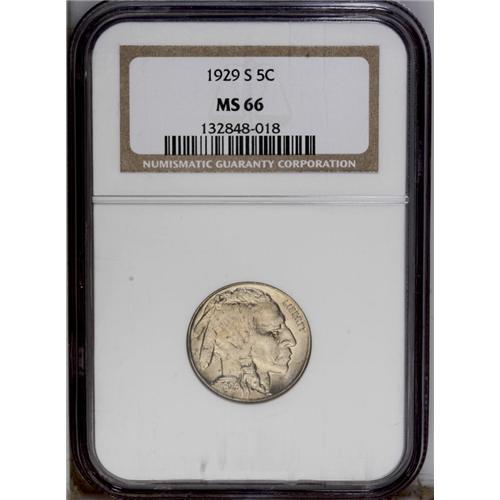 <B>1929-S<5C> MS66 NGC.</B></I> A frosty Gem example with brilliant nickel-gray luster and wispy gold toning on both sides. This is a surprisingly scarce issue in such high grades, with only one finer example certified by NGC. Census: 36 in 66, 1 finer (3/06). <BR><BR><B>Important notice:</B> Heritage usually auctions material at the rate of 200-250 lots per hour. On some occasions eBay Live bid software or the Internet may not be able to keep up with the pace of the auction. We recommend placing a realistic absentee bid now as insurance to avoid disappointment. Occasionally the auctioneer may eliminate or reject an eBay Live bid, and the auctioneer may also reopen a lot after the close of the eBay live bidding (usually because we missed an audience bid), and may reject your bid even if it shows you as the winning bidder. By bidding via eBay Live, you agree that Heritage may award the lot to another bidder at its sole discretion under the circumstances described above or any other reasonable circumstances. Since eBay bids are not shown to us until we open the lot on the floor, we treat those bids just like floor bids. In most cases the floor responds before the eBay bid is presented to us, due to Internet lag time, so for consistency we have made it a policy that floor bids are always considered first over tie eBay live bids. Also please note that all Heritage lots purchased through eBay Live carry a 20% Buyer's Premium. Please make sure you read the Terms and Conditions before you bid. This lot is being auctioned in conjunction with a live floor auction by Heritage Galleries & Auctioneers. All final auction and invoice information will be supplied by Heritage Galleries & Auctioneers, and all other information should be considered preliminary. Lot:1110 <BR><BR><B>Winning Notification and Billing:</B> After the FINAL session in this auction is complete, Heritage will send e-mail and snail mail invoices. This process normally takes several days. All final auction and invoice information will be supplied by Heritage Galleries & Auctioneers, and all other information should be considered preliminary. <BR><BR>This auction will be conducted on a live auction floor and over the Internet through eBay Live. If you choose to place an absentee bid, please take a moment to <font color='#0000ff'><u><a href='http://pages.ebay.com/liveauctions/help/before/laabsentee.html'>learn how eBay Live absentee bidding works</a></u></font><font color='#000000'>