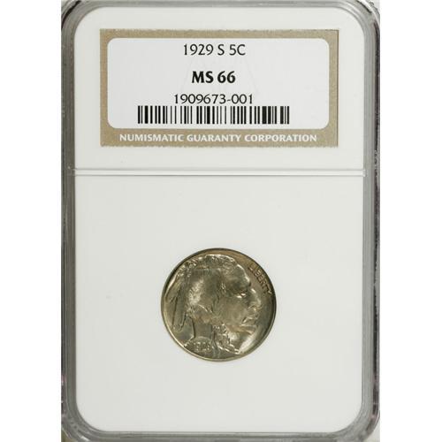 <B>1929-S 5C MS66 NGC.</B></I> Olive and salmon-pink embrace this satiny and remarkably preserved Premium Gem. The strike is decidedly above average, although the hair above the braid lacks absolute detail, as always for the issue. Census: 37 in 66, 3 finer (3/07).<BR><BR><b>Shipping:</b> Coins & Currency (<a target="_blank" href="http://www.heritageauctions.com/common/shipping.php">view shipping information</a>)