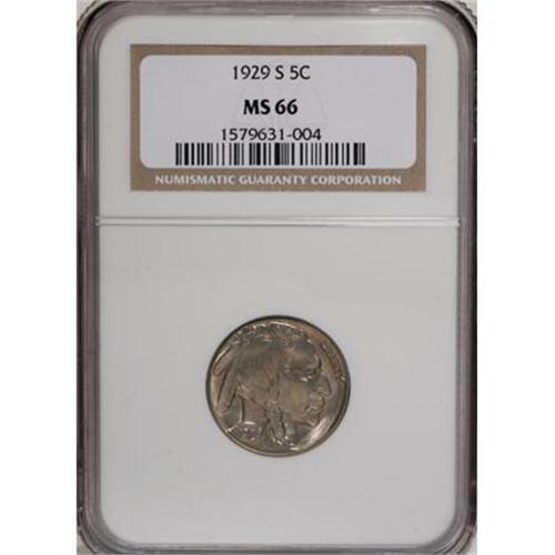 <B>1929-S 5C MS66 NGC.</B></I> Vibrant luster exudes from champagne-gold surfaces, and an attentive strike results in excellent definition on most of the design elements. Well preserved throughout. Census: 43 in 66, 4 finer (1/08).<BR><BR><B>Coin Engraver:</B> James E. Fraser<BR><BR><b>Shipping:</b> Coins & Currency (<a target="_blank" href="http://www.heritageauctions.com/common/shipping.php">view shipping information</a>)