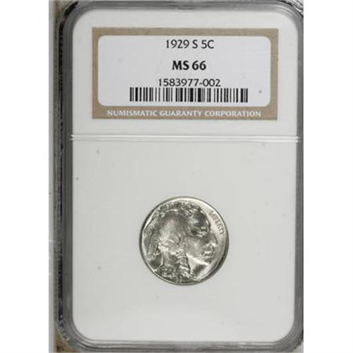 <B>1929-S 5C MS66 NGC.</B></I> . NGC Census: (43/4). PCGS Population (160/5). Mintage: 7,754,000. Numismedia Wsl. Price for NGC/PCGS coin in MS66: $1,375. (#3968)<BR><BR><B>Coin Engraver:</B> James E. Fraser<BR><BR><b>Shipping:</b> Coins & Currency (<a target="_blank" href="http://www.heritageauctions.com/common/shipping.php">view shipping information</a>)