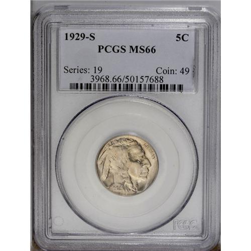 <B>1929-S<5C> MS66 PCGS.</B></I> This high grade Nickel is bursting with glowing, satiny luster. The pastel tinted features are sharply defined with no mentionable distracting blemishes. <BR><BR><B>Important notice:</B> Heritage usually auctions material at the rate of 200-250 lots per hour. On some occasions eBay Live bid software or the Internet may not be able to keep up with the pace of the auction. We recommend placing a realistic absentee bid now as insurance to avoid disappointment. Occasionally the auctioneer may eliminate or reject an eBay Live bid, and the auctioneer may also reopen a lot after the close of the eBay live bidding (usually because we missed an audience bid), and may reject your bid even if it shows you as the winning bidder. By bidding via eBay Live, you agree that Heritage may award the lot to another bidder at its sole discretion under the circumstances described above or any other reasonable circumstances. Since eBay bids are not shown to us until we open the lot on the floor, we treat those bids just like floor bids. In most cases the floor responds before the eBay bid is presented to us, due to Internet lag time, so for consistency we have made it a policy that floor bids are always considered first over tie eBay live bids. Also please note that all Heritage lots purchased through eBay Live carry a 20% Buyer's Premium. Please make sure you read the Terms and Conditions before you bid. This lot is being auctioned in conjunction with a live floor auction by Heritage Galleries & Auctioneers. All final auction and invoice information will be supplied by Heritage Galleries & Auctioneers, and all other information should be considered preliminary. Lot:1109 <BR><BR><B>Winning Notification and Billing:</B> After the FINAL session in this auction is complete, Heritage will send e-mail and snail mail invoices. This process normally takes several days. All final auction and invoice information will be supplied by Heritage Galleries & Auctioneers, and all other information should be considered preliminary. <BR><BR>This auction will be conducted on a live auction floor and over the Internet through eBay Live. If you choose to place an absentee bid, please take a moment to <font color='#0000ff'><u><a href='http://pages.ebay.com/liveauctions/help/before/laabsentee.html'>learn how eBay Live absentee bidding works</a></u></font><font color='#000000'>
