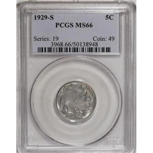 <B>1929-S 5C MS66 PCGS.</B></I> Well-defined for this often-challenging San Francisco issue with minimal patina and strong, pleasing luster. Beautifully preserved and a visual delight. PCGS has graded five finer pieces (1/08).<BR><BR><B>Coin Engraver:</B> James E. Fraser<BR><BR><b>Shipping:</b> Coins & Currency (<a target="_blank" href="http://www.heritageauctions.com/common/shipping.php">view shipping information</a>)