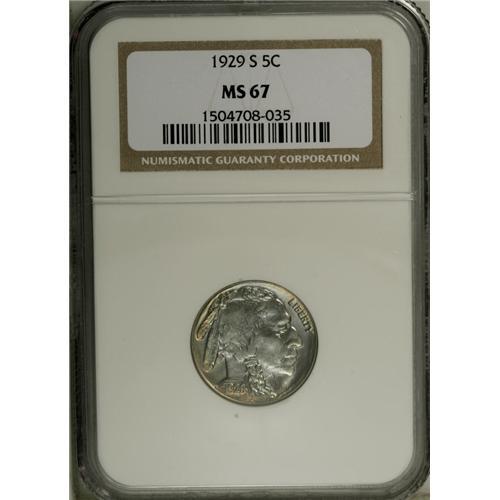 <B>1929-S 5C MS67 NGC.</B></I> The striking details are essentially full, as is the remarkably effulgent mint luster. More remarkable still is the beautiful steel-blue and golden toning that adorns each side of this seemingly pristine, conditionally rare Superb Gem. NGC and PCGS combined have graded a mere eight pieces at MS67, with none finer at either service (11/06).<BR><BR><b>Shipping:</b> Coin/Currency (<a target="_blank" href="http://www.heritageauctions.com/common/shipping.php">view shipping information</a>)