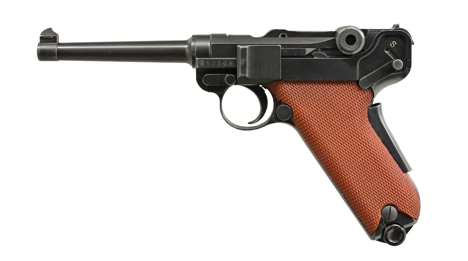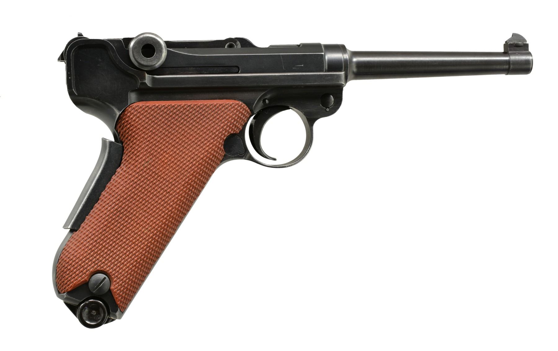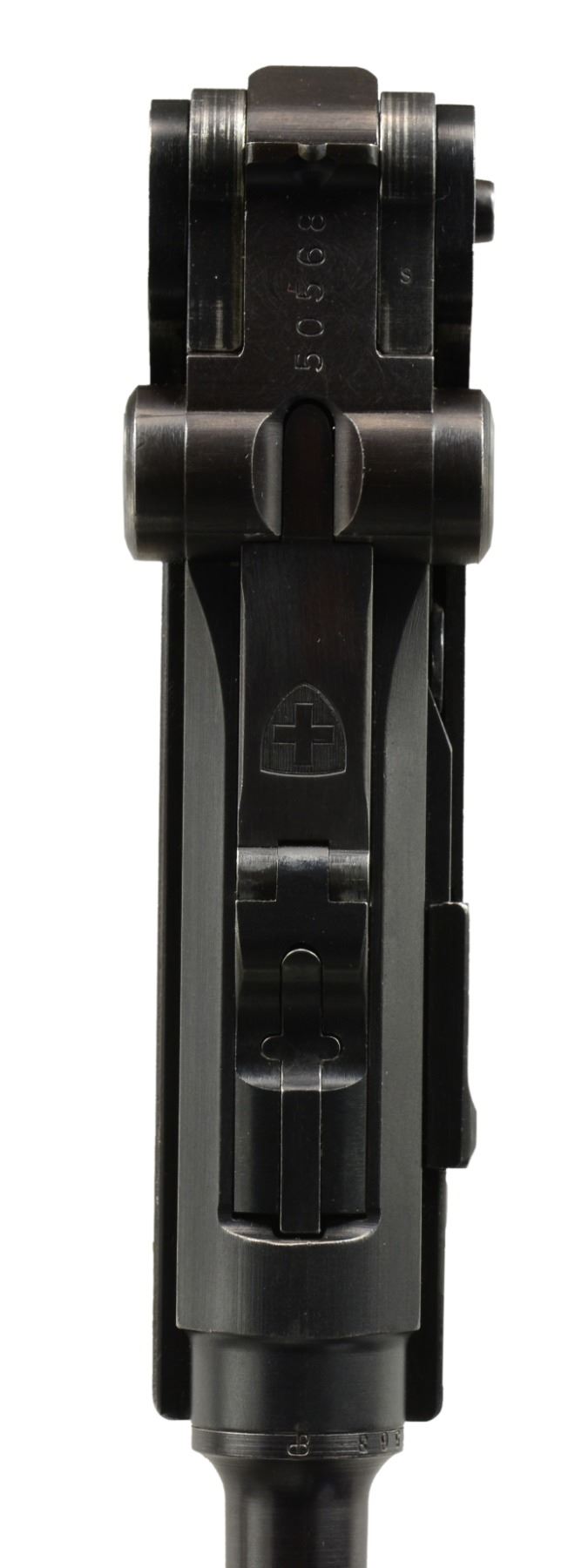 Cal. 30 Luger. S# 50568. Bbl. 4 3/4". Distinctive Swiss military features to include: straight front strap, checkered red plastic grips, special bbl. length, lg. grip safety straddling back strap plus uncheckered mag. release button, takedown lever knob & thumb safety. Numerous cross / GC proofs throughout; mfg. S# 50001 to 77941 w/out commercial P prefix. Inside front of frame dated 10.33. Firing pin has 2 gas relief slots; square cut & shallow. Matching numbers on frame, receiver, bbl., smooth knob rear toggle & sideplate; extractor numbered F27. Frame S# preceded by boxed "+" over "N". Underside of front receiver rails w/ import marks. Back of receiver at top stamped w/in circle "F" over "W" having circular sides plus "+" among those letters. MAGS: 1 very good to excellent Swiss 8 rd. having brown plastic base retained by 2 pins on nickel plated body. "P" Stamped at base of spine. CONDITION: very good overall appearance w/ minimal high point & functional wear. All blued finish w/ some internal sm. parts in the white. Front locating rib on back of grips missing on right & 60% gone on left; near excellent exteriors. Near excellent bore. (20-371/NW). CURIO. $1,000-1,500.