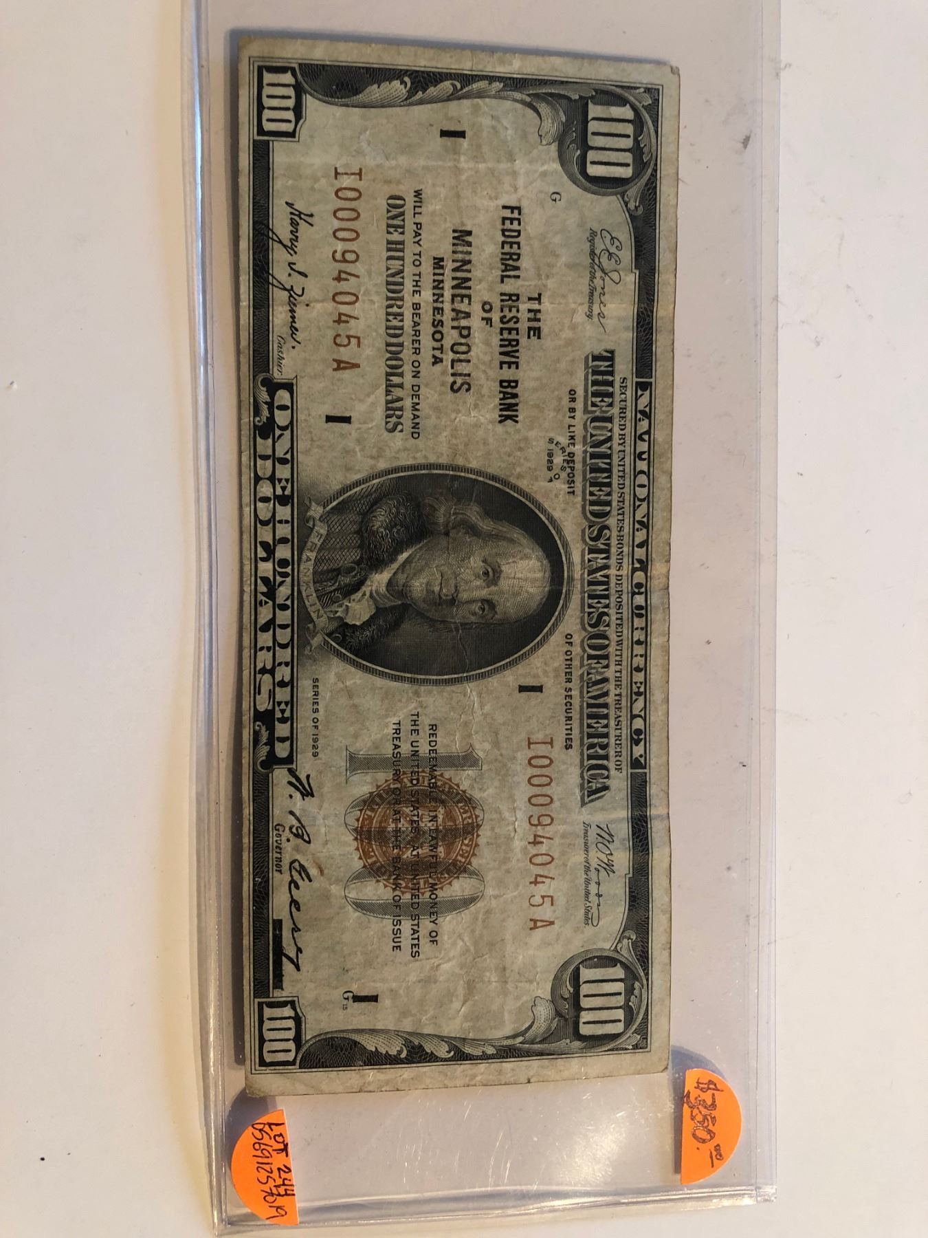 1929 Series 100 Dollar MINNEAPOLIS Federal Reserve Bank Note XF High Grade