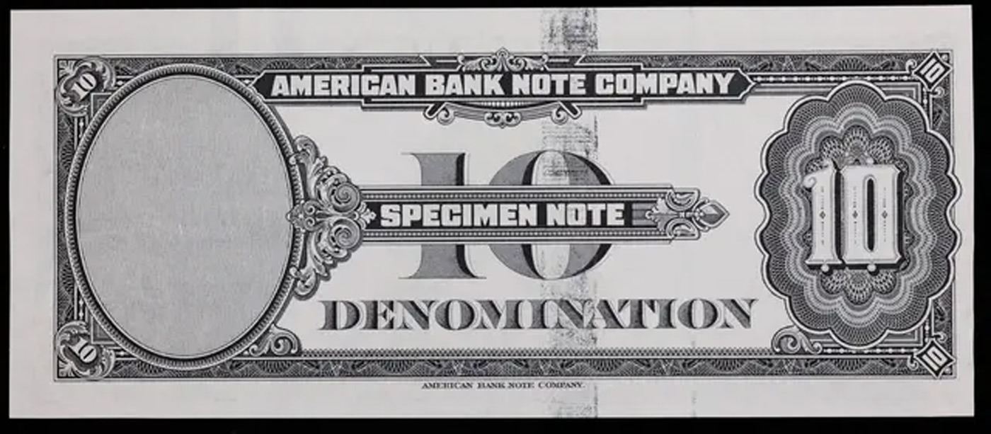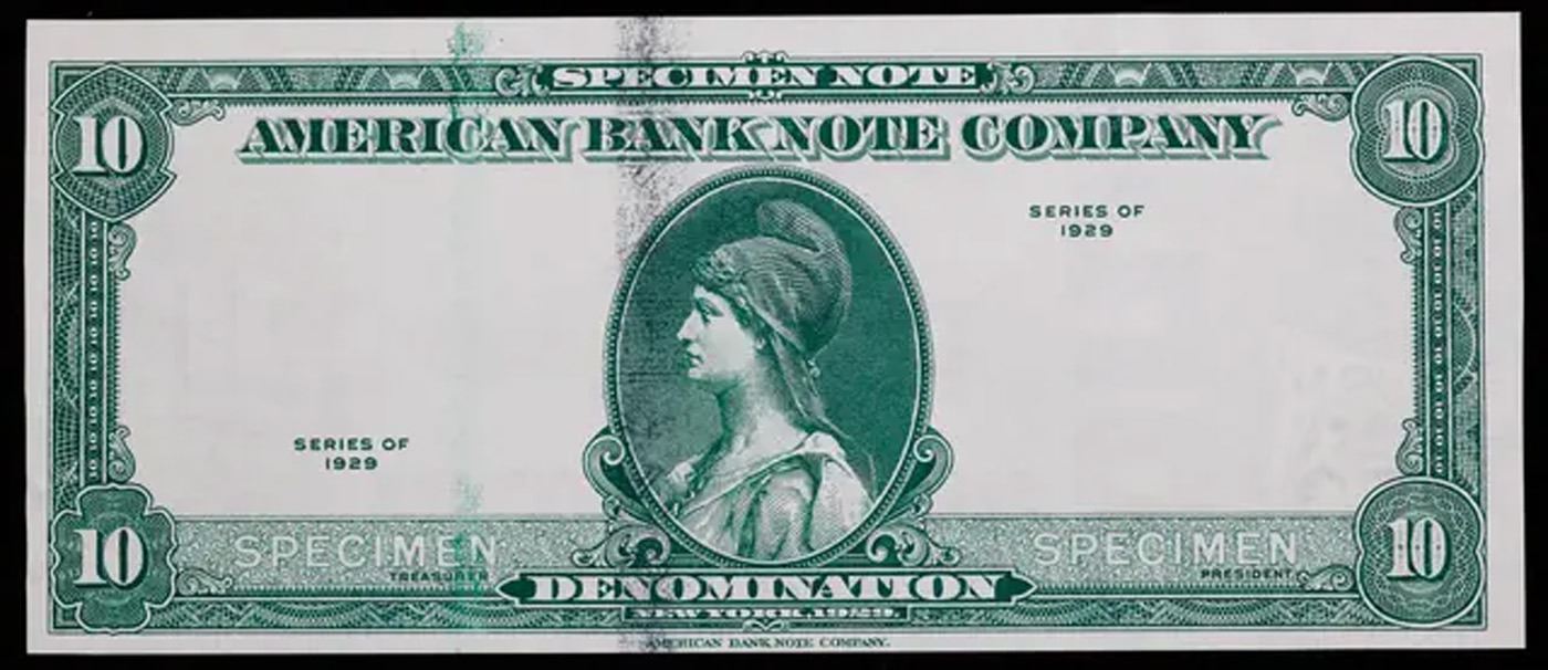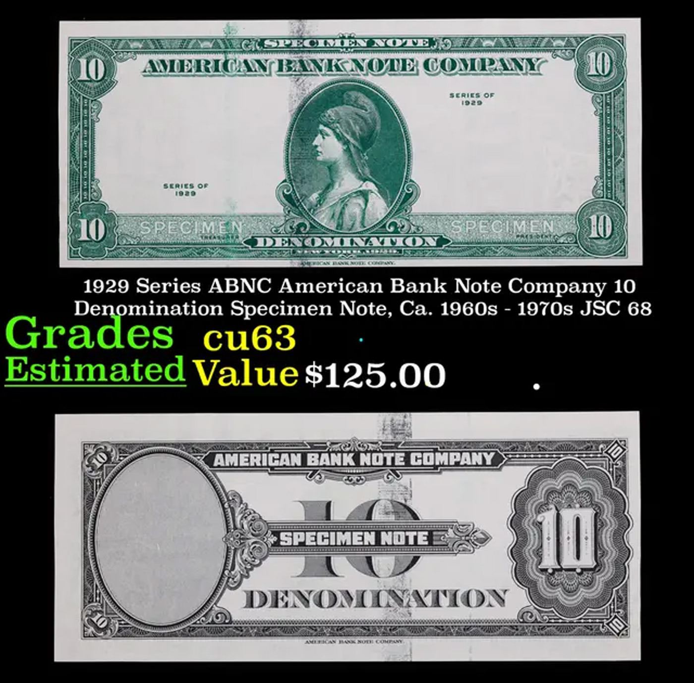 1929 Series ABNC American Bank Note Company 10 Denomination Specimen Note, Ca. 1960s - 1970s JSC 68