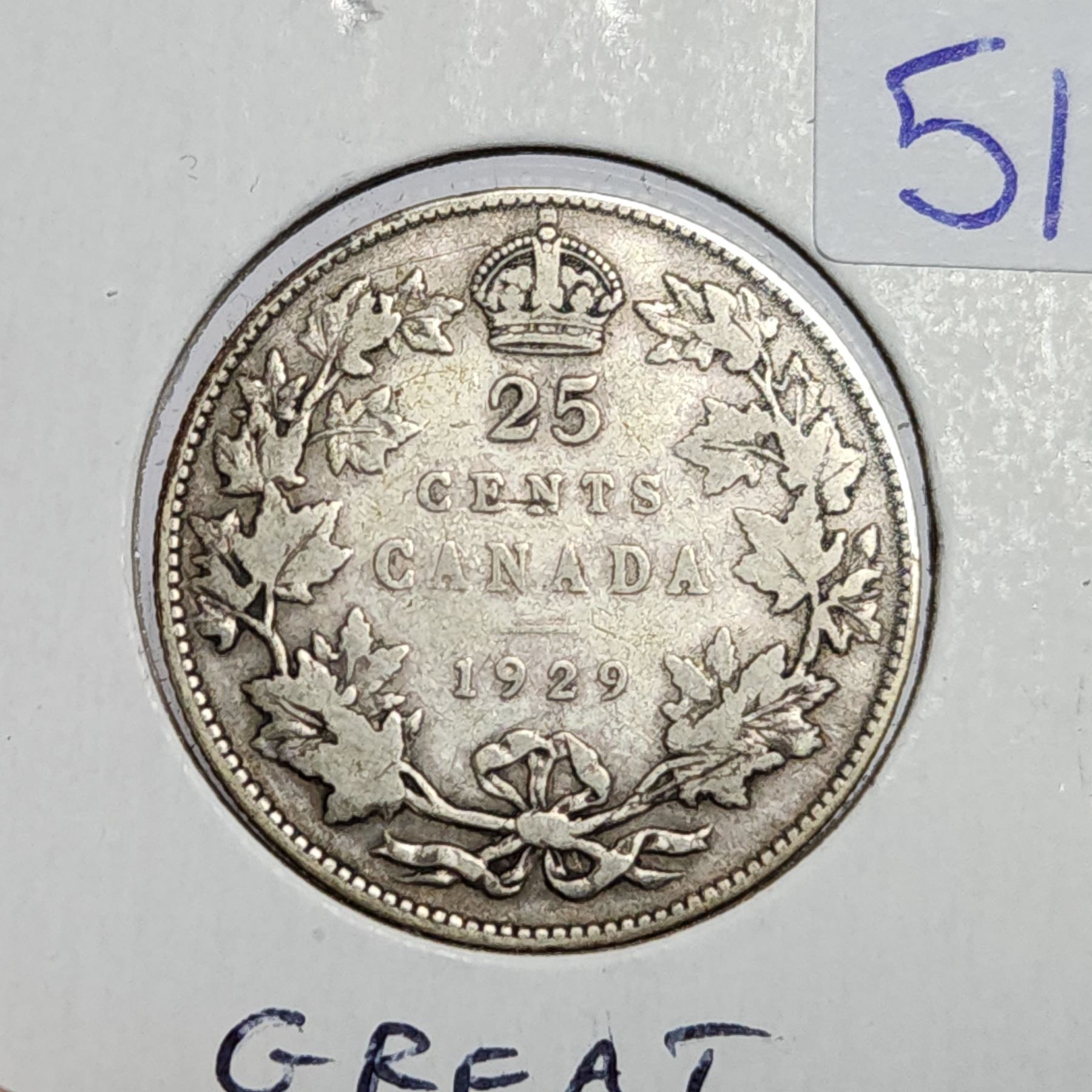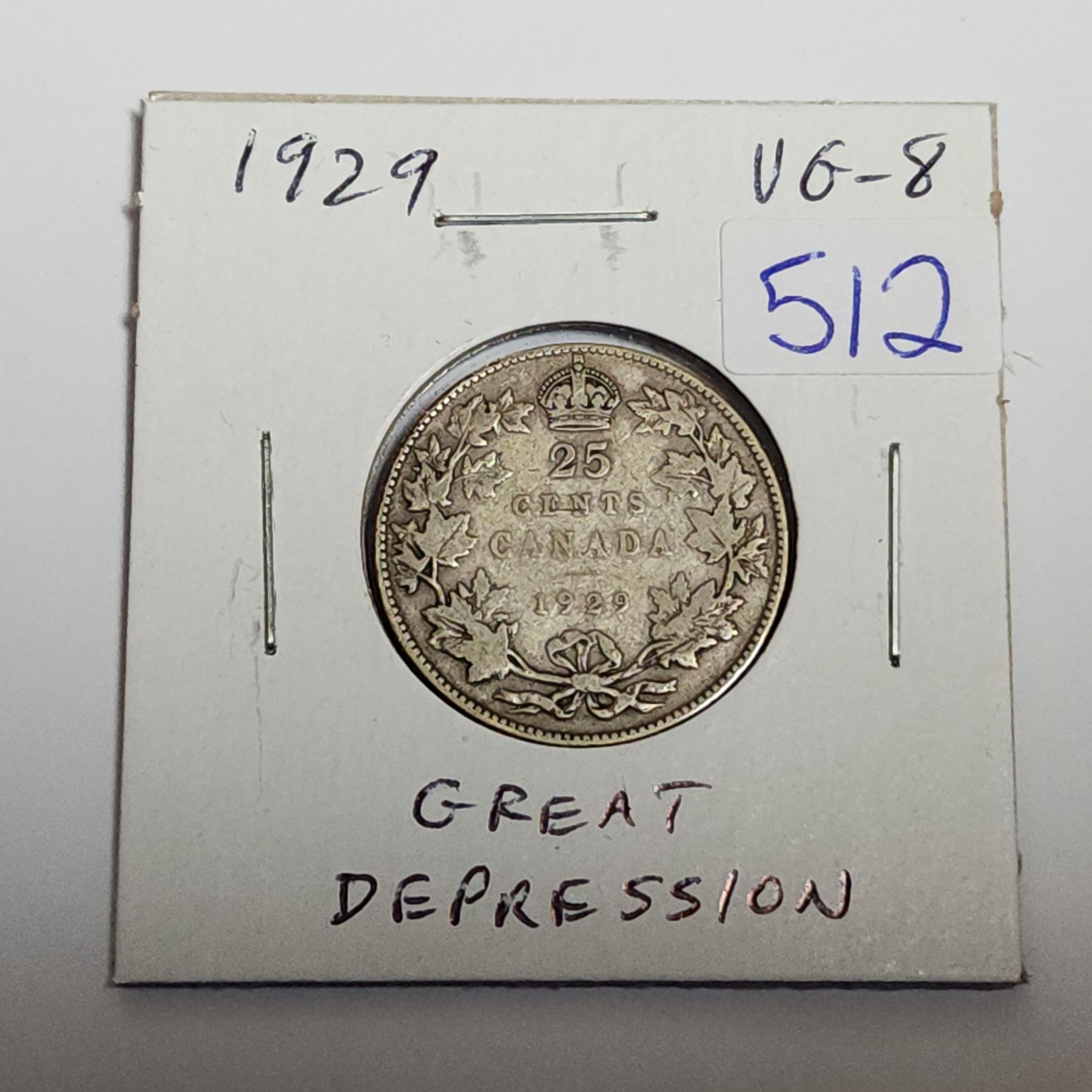 1929 Silver 25 Cents. Issued during the first year of the Great Depression. VG-8.